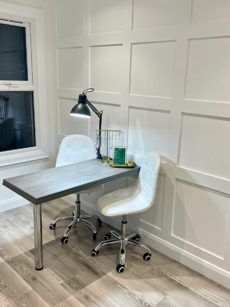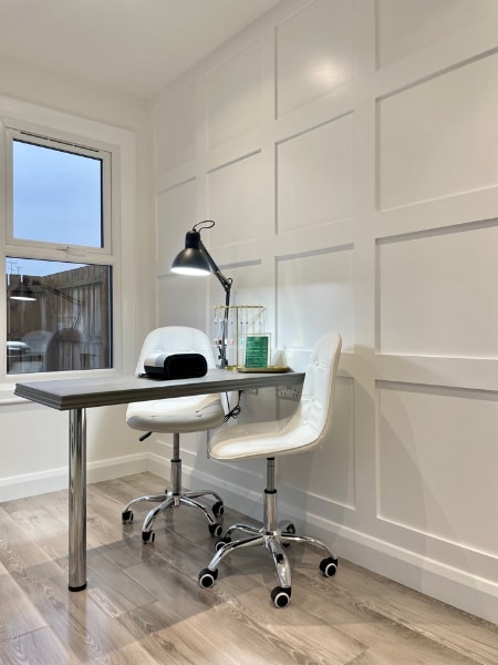 “I decided to go for classy and elegant décor, such as the white panelling, grey wooden floor and the wooden nail table with chrome finishes. By adding the grey touches, it has added a bit of warmth to the salon.