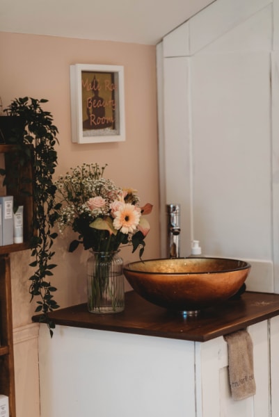 “I’ve recently been on maternity leave. While I was off, I decided to relaunch the salon, which included a full renovation. I chose a nude palette with calming and subtle décor. I also added touches that are in style at the moment, for example panelling and my pampas grass mirror, which I made myself. I chose this theme to create a feel of luxury but also serenity whilst performing all treatments.