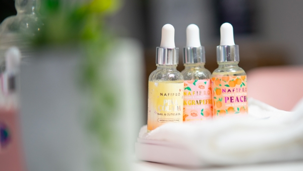 “The products I use for nail services are The GelBottle, Glitterbels and Peacci,” she says. “I love Peacci Skin for my manicures and pedicures. I finish nail treatments with Naf! Stuff Cuticle Oils – my clients really enjoy picking out their favourite scent.”