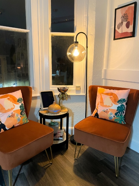 “My theme is calm, warming, happy and a little bit sassy! I kept the walls white, as I wanted the salon to feel light and airy with the lovely bay window being the feature of the room.