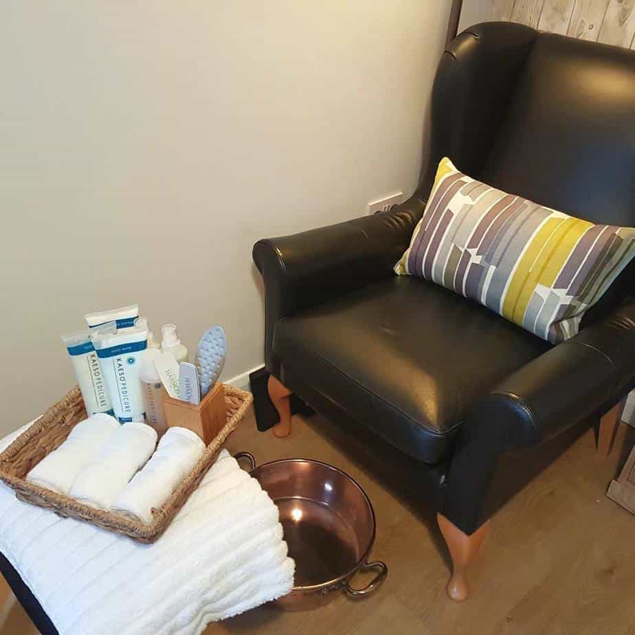 “I thought long and hard when choosing the layout, decor and style of my nail room,” Yvonne adds. “I wanted to create a homely, comfortable space with a timeless style, where clients could walk in and feel immediately at ease. I chose natural wood & leather furniture, cool greys with mustard accents and copper accessories. The drift wood feature wall offers warm tones and interest. My pedicure bowl is my Grandmother’s jam making pot, which is the perfect size and fits nicely with the look of the room!”