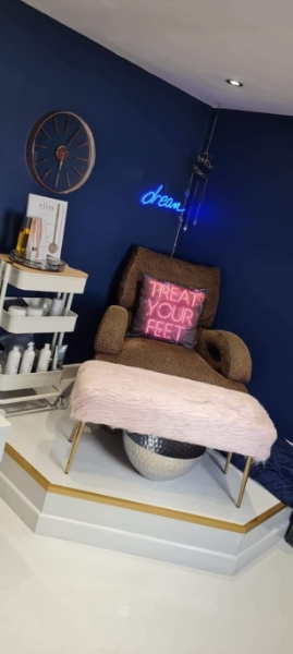 “I also offer luxury and express Elim pedicures with gel toes – these are very popular as my clients absolutely love my funky leopard print pedicure chair,” she explains. “I go full-on luxury in this chair, so that my clients forget the world with a weighted blanket to reduce anxiety and heated bootie.”