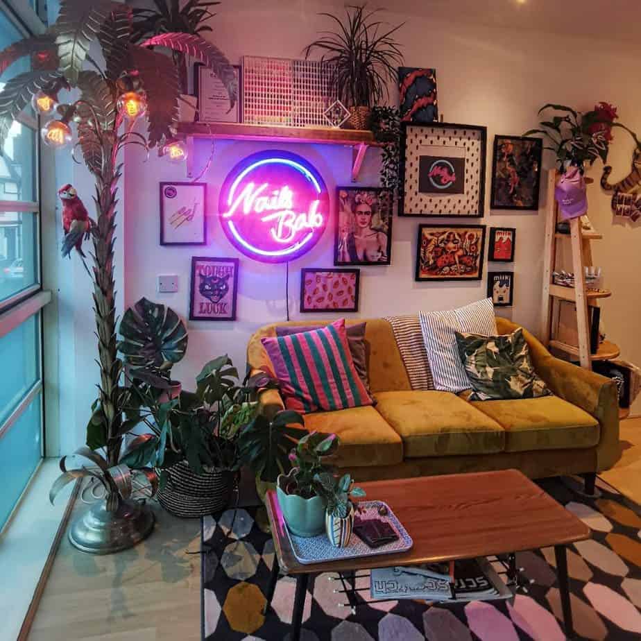 “I have a 7ft vintage palm tree lamp and custom-made neon light of my logo, alongside a 70’s style sofa, coffee table and rug.