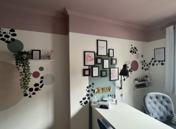 The decoration of Nails With Kails took around three weeks, with Kayleigh doing this between clients, working full-time and planning her wedding. “It was a labour of love,” she says. “The theme includes my favourite colours and there is a focus on abstract details, as this is my favourite nail art to create on clients and Dalmatian print has a special place in my heart! I have to admit, I was incredibly nervous when painting the ceiling, as I’d never done anything so adventurous before and the paint appeared brown at first. However, this turned out lovely and is one of my favourite parts of the salon.”