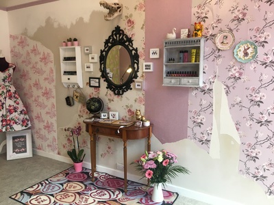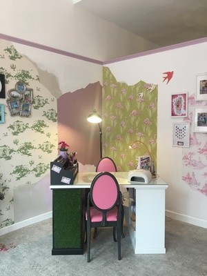 Frenchie style reverberates through her her salon, Neverland. “Both my studio space and my new salon were inspired by things from my childhood,” she states. “I remember helping my dad redecorate when he bought a house from an old lady. I loved peeling back all the layers of wallpaper, seeing all the layers of colours, textures and patterns, and that’s something I wanted to feature in my salon. Most salons I see now are very minimalist, clean lines, lots of white. While that’s lovely, it’s just not me at all. More is more is my style. I wanted my clients to feel comfortable and relaxed, as if at home. And where do you feel more at home than in your granny’s living room?! I love colour, and mixing old and new together.”