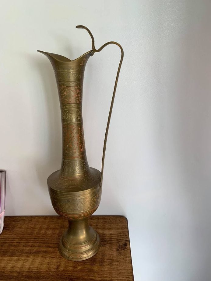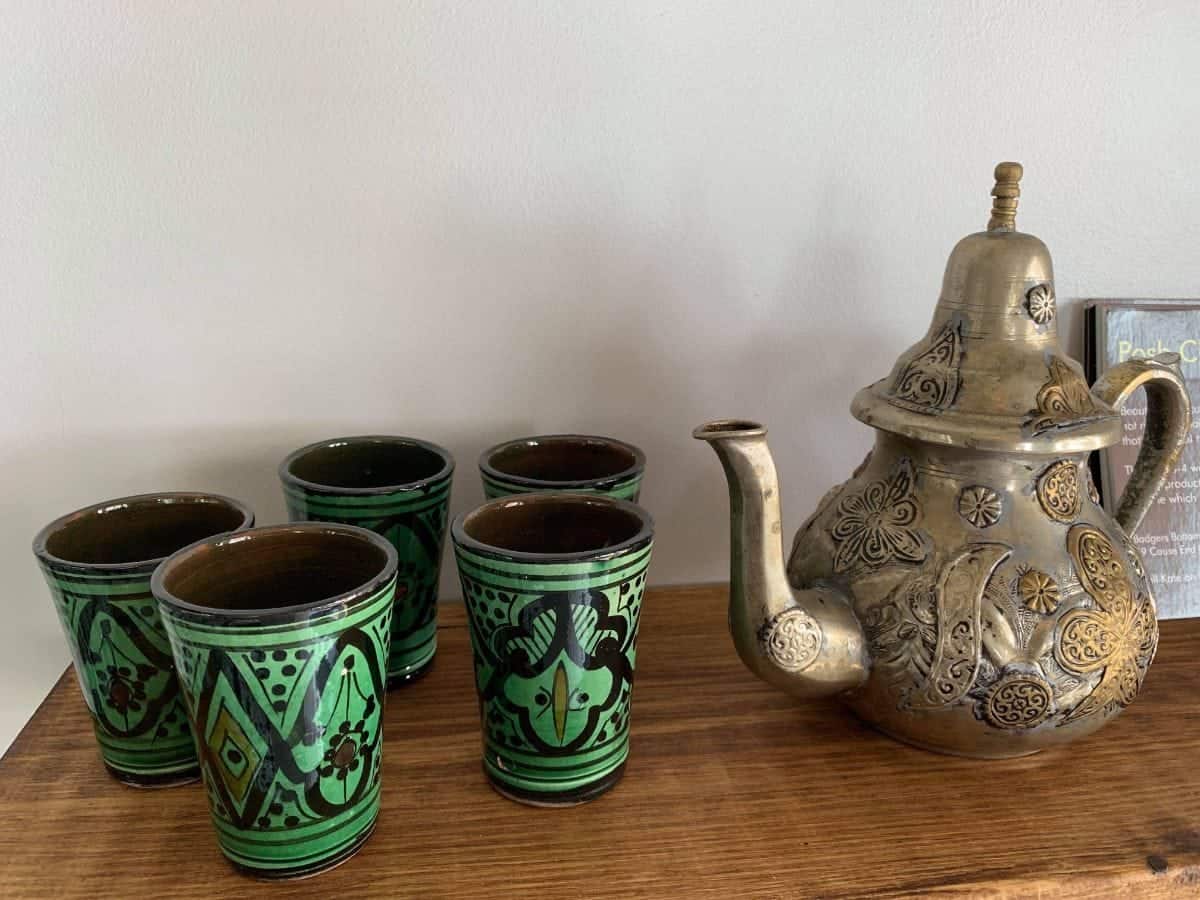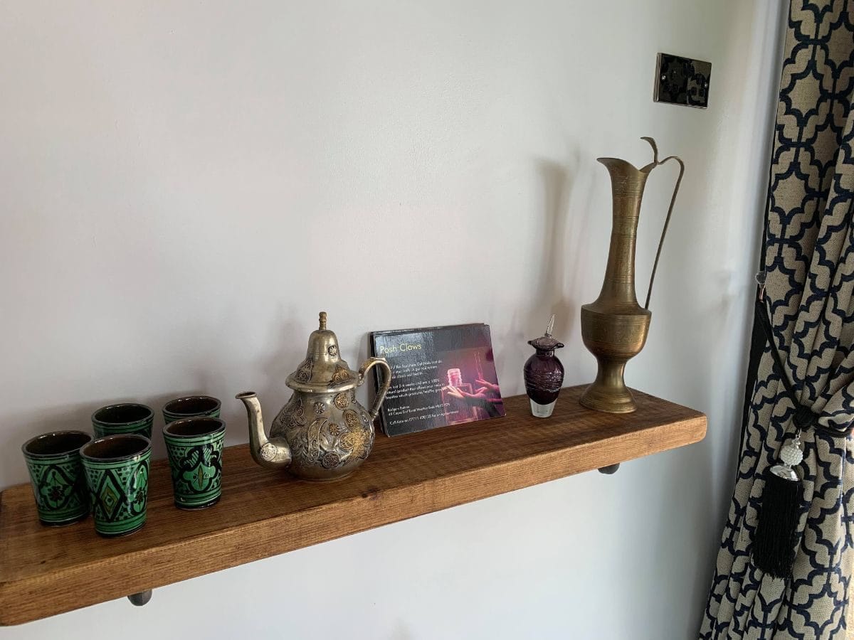 “For the soft furnishings, I decided on a geometric Moroccan design accented with opulent tie backs. I accessorised with ornaments I already owned, including an old silver and brass teapot which I had been chased with through the medina in Marrakesh! The tea cups I had been persuaded to buy that had fallen out of the van on the way to the airport but had survived in tack. Finally, I added the brass embellished jug that my grandfather had bought my grandmother back from the war before he later died in Arezzo.