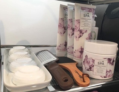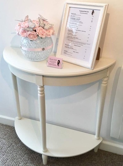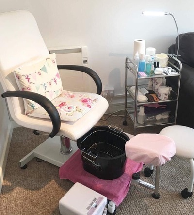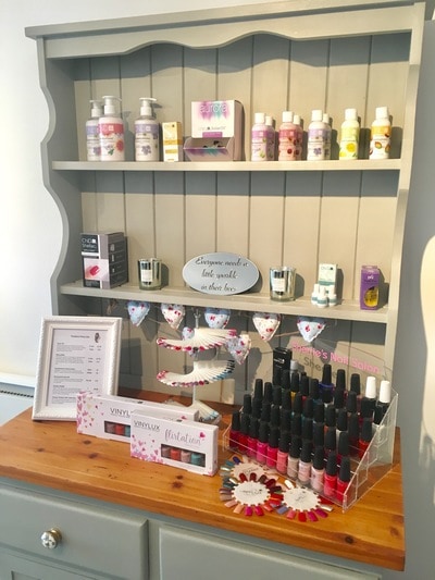 In terms décor, Sherrie chose a muted palette of shades to create a homely atmosphere. “I am slightly limited in wall colours as the room is rented but have overcome this by accessorising. I’ve chosen a modern design for my nail desk and most importantly comfy chairs for both myself and client. A sofa allows clients to visit with friends and great when facilitating wedding parties. A hand painted ‘shabby chic’ style dresser perfectly displays retail items and simple cushions in Cath Kidson-style complement the whole look.”