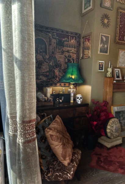 “My personal style is heavily influenced by Stevie Nicks and Morticia Addams, so I’ve used vintage and thrifted elements to create a bohemian gothic vibe,” April says.