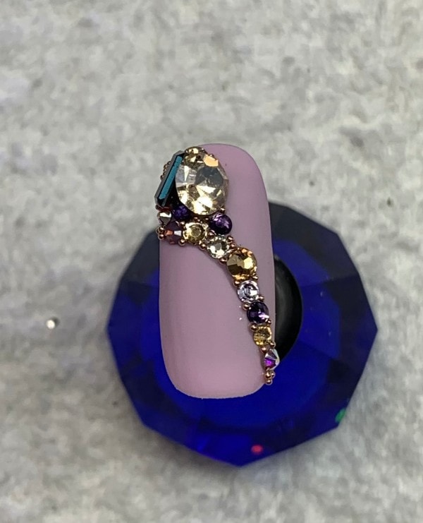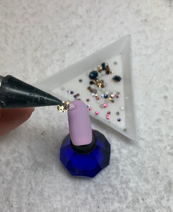 One of most important notes for endurance, especially with larger crystals, is using enough gel to ensure it grips around the entire edge of each crystal’s base. Think of it like a ‘gel prong,’ which will hold the crystal in place in the way that a prong holds a diamond in a ring.