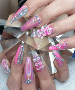 Acrylic nail designs are my most popular. My clients love love love glitter and bling. Recently I’ve found that more clients are choosing to have infills rather than a design in gel polish.