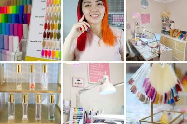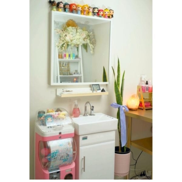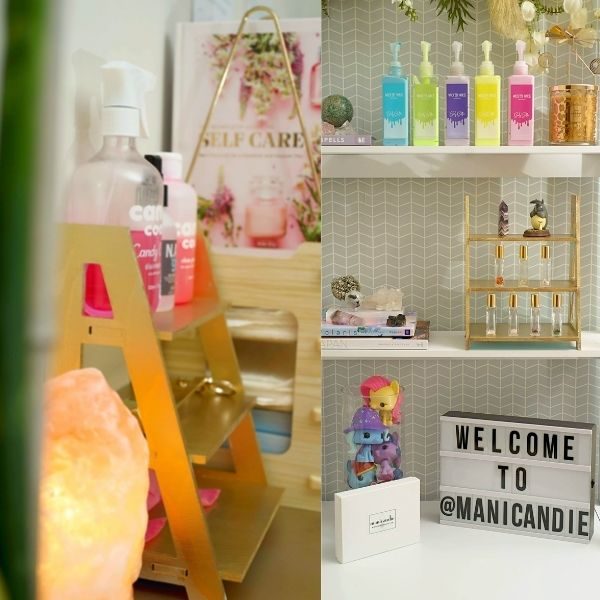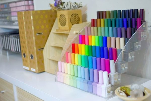 A mix of pastel and gold shades exuding cute kawaii vibes in a room filled with crystals, Lynda tells Scratch, “I’m trying to create a fun, comfortable environment where everyone will feel welcome. There’s always something that will catch a client’s eye and we then have something to talk about to break the ice. I love being different. I have a Gashapon machine for mystery sets, a table filled with stickers and a crazy amount of colours and nail art products.”