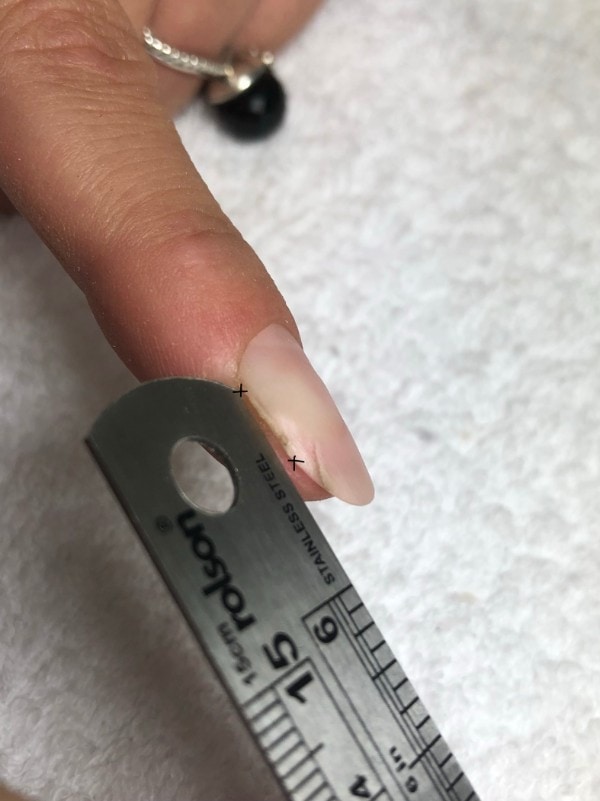 Regardless of the shape, the point where the nail extension leaves the nail bed should be free of notches and come out completely straight, not tilted up nor down which will put unnecessary pressure on the enhancement (above). This is where correct form or tip fit is necessary.