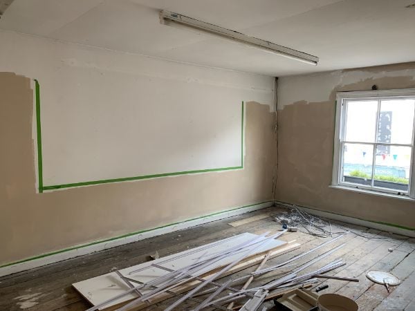 We are now upstairs in the training room, and the new floor is about to be laid and I’ve kept the same colour scheme throughout. The electrics have been re done downstairs where the shop part will be, and the electrics are being done in the training room also with floor points and lower wall points. All electric points have been replaced with industrial style units with USB points built in. We had light switches and light pull cords that turned on lights in different rooms with a mixture of strip lights, LED lights and pendants all over the place so this has been a time consuming job. We are so fortunate that my husband and my brother in law have the skills to do all of these jobs which cuts down on price, yet it takes longer as we all work many hours as it is.