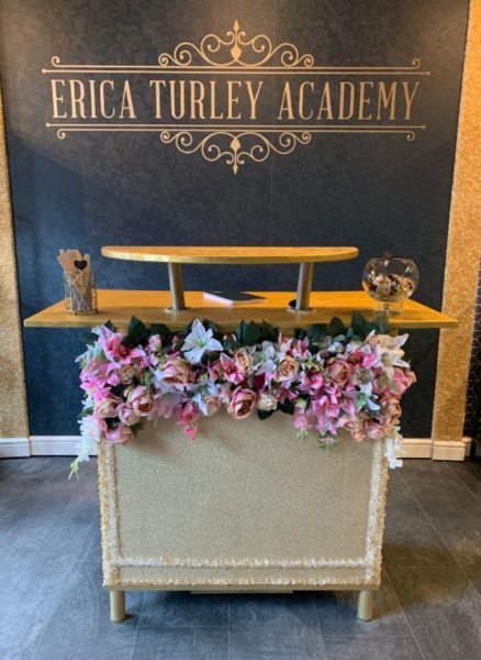Another find was a reception desk I purchased via Shpock. I’d never even heard of this app until my hairdresser, Sarah Mason, said it was brilliant for salon furniture. A beauty salon in Wolverhampton was selling its reception desk and I got it for £90. I’ve completely changed everything, I took it apart, sanded it down, sprayed the legs, covered the sides to match the academy interior, re sprayed the top, finished it gold flakes added some crystals and hey presto, a new reception desk! I’m really pleased about how it has turned out.