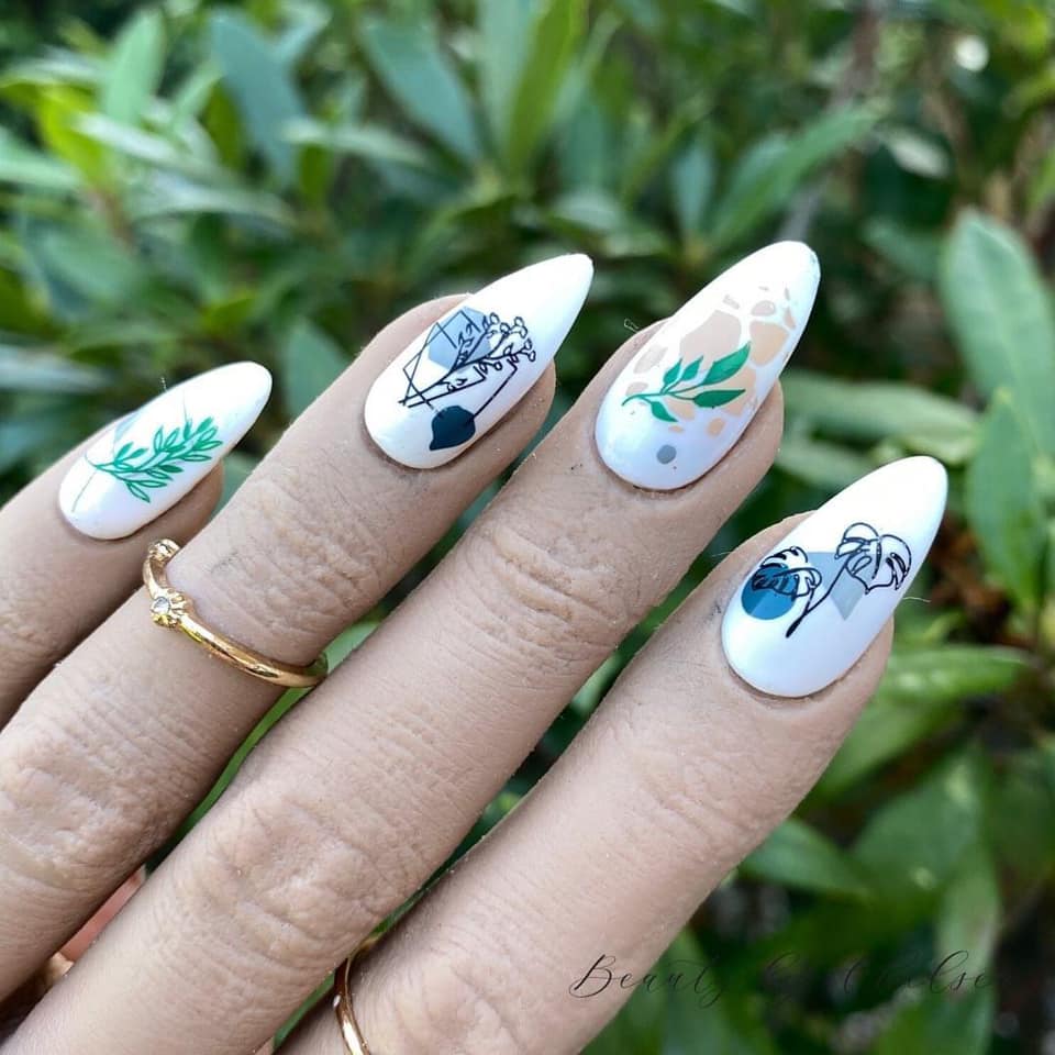 Chelsea Tipper, of Beauty by Chelsea, says that this white botanical design has been popular with clients across her social media platforms.