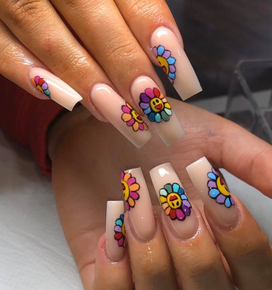 Holly Innes, of HLYIB, reveals this J Balvin-inspired nail design has been popular with her clients due to its vibrant colour palette.