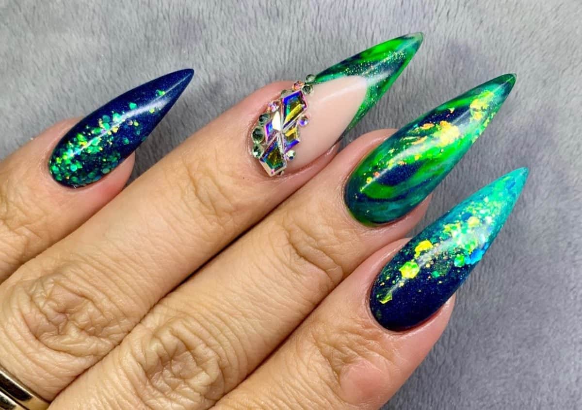 Amanda Byrne, of Divine Nails By Amanda Byrne, wears a stunning emerald, Northern Lights-inspired design.
