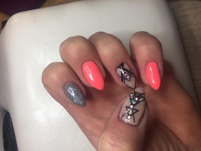 “I used to struggle with weak nails so I always use a builder gel over my natural nails to give them the extra strength. For the thumb and ring finger I used a beige tone with a very gentle silver glitter polish over it. After I applied my top coat, I stamped the Aztec design before top coating again and placed Swarovski gems. For my middle and little fingers, I chose a lovely bright coral perfect for the sunny weather. For my index finger, I opted for a camo-green/grey with holographic foil for a little extra bling.”