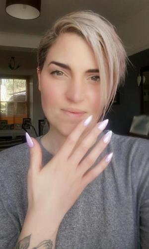 “I used the full Magpie Beauty Gel Colour system and, as these are my natural nails, I included two layers of Give Me Strength to add extra strength to my manicure – I love this product! I used Pearls A Singer as my base colour, glitter in Flossy and the Shelly dust, which I applied to Don’t Be Tacky and then top coated twice. For the line work, I used Plain Jane gel, applying it with Magpie Beauty nail art brushes.