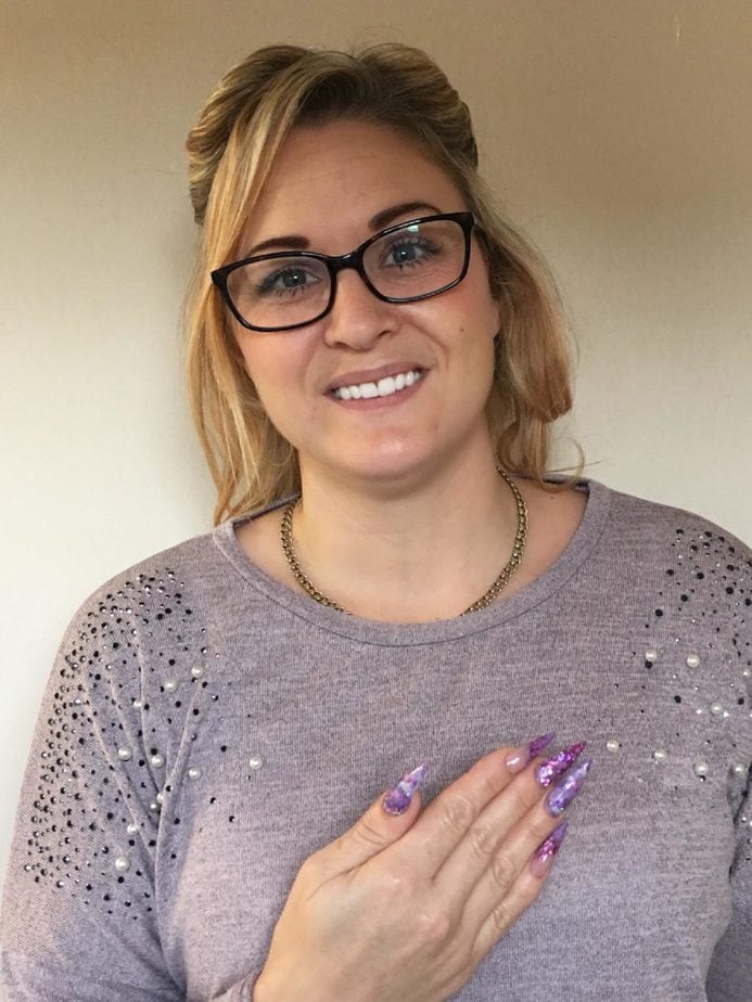 Irene Wright, of Bliss Nails by Irene Wright, wears violet hues in a design that features lashings of chunky glitter, colour fades and marbling.