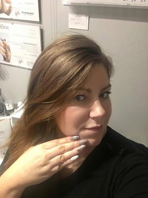 “After creating an acrylic enhancement, I filed and buffed my nails into shape. I applied my Gelish colours and cured.