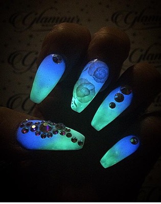 “For this set, I mixed a glow in the dark pigment into my acrylic. I mixed blue pigment into a cover pink and a green pigment into the white acrylic to create a babyboomer french effect by day and by night it turns into a blue-green glow in the dark ombre! For the finishing touch, I then used Brillbird 3D Forming Gel to create the roses and finished off with crystals from Glitterarty Nails.”