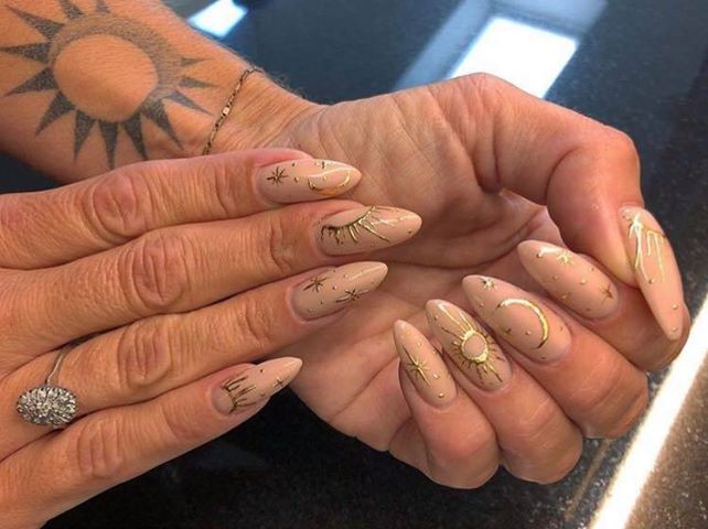 Talented tech, Terri Eaton, wears nude almond nails finished with gold celestial detailing.