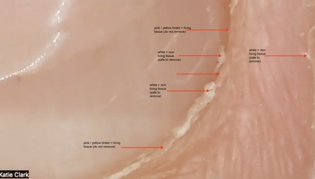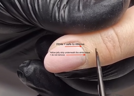A dermatologist quoted: ‘Everything that is yellow, pink and green (and the bone) is ‘living’’, including the eponychium, which is the yellow tinted jelly strip at the bottom of the nail, the nail folds, the nail bed, located underneath the nail plate, and the matrix. The cuticle and hangnails and any area safe to be removed is displayed as white. This white tissue can display on-top of that yellow tinted jelly strip of the eponychium, which means you can remove the white non-living tissue but must not continue into the yellow tinted jelly strip or any areas that are pink. This is where using precision scissors can be more beneficial than nippers if you use them, as you can target smaller areas and never have your view blocked by the blades.