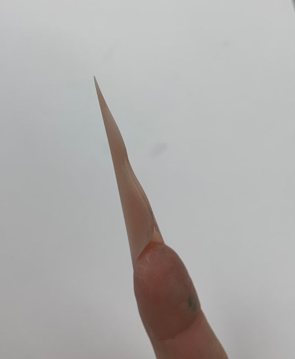 When creating a nail shape that needs to end in a compete point, the c-curve throughout the whole free edge shape you create is paramount. This comes down to correct form fit. Look at a nail form and decide on the finishing point. Look at the way the form is closed for a shape like this, it should be in the shape of a ‘V’ from the birds eye view and from the natural free edge join and the free edge, the form gets narrower as it reaches the end. However, if the form is not fully closed at the finished point, then a resultant complete point will be impossible to achieve.