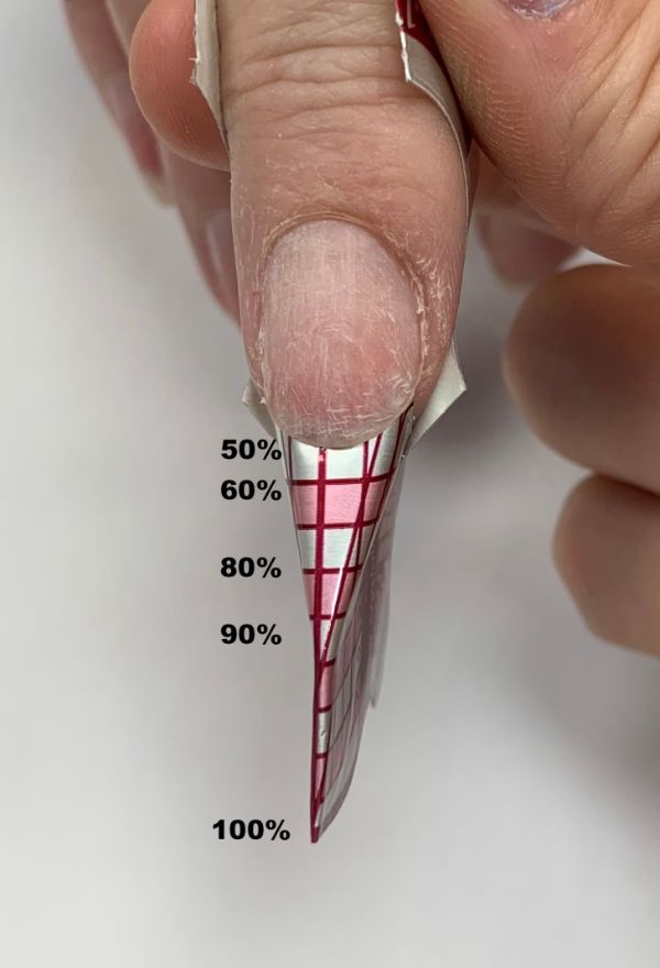 A nail tech measures the c-curve depth by dividing a circle into parts. Half of a circle provides a 50% c-curve. Bring this line down a little and it creates a 60% c-curve. Raise this a little and it creates a 40% c curve and so on. A 100% c-curve will be fully closed underneath.