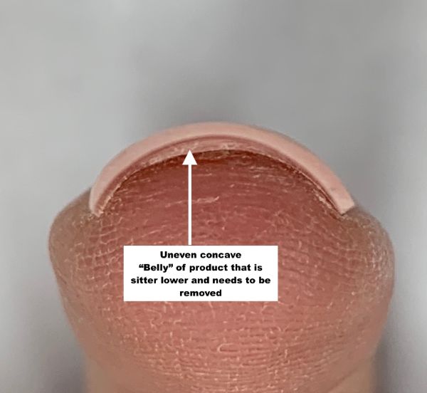 When you apply an enhancement product it will naturally sit in this dip. This dip will be visually apparent on the concave of the enhancement and appear like a small ‘belly’ hanging down from the roof of the concave.