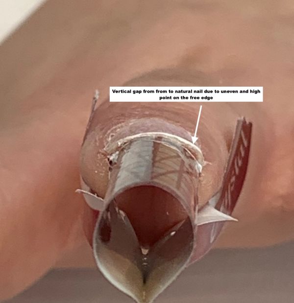 A client that frequents our nail desk more often than we may realise is one whose natural nail has an irregular shaped c-curve at the free edge. While a tech may be tempted to blame their skills, when working on a nail like this the form or tip will not be able to sit seamlessly to that higher part of the natural nail. This will leave a small vertical gap between the natural nail and the form or tip.