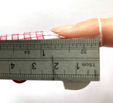 As we have covered, nails do not grow perfectly and may also be missing corners due to damage or trauma. Because of this, when we fit a form from the side view and check its positioning, we measure against the finger and not the natural nail side wall. Fingers are often crooked, so it is important to only use the end finger joint to measure this.