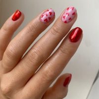 Emily Cording of @cuteycles.nails.by.emily created this Valentine’s nail art using Gelish, including foil to add a deeper dimension to a red gel polish hue.