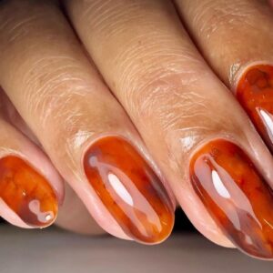 Fossilise fingertips with captivating palettes of glowing orange, warm brown, and glittering gold inspired by the amber gemstone, upgrading burnt orange hues with depth and dimension. Check out our roundup of 30 amber-inspired nail art styles below…