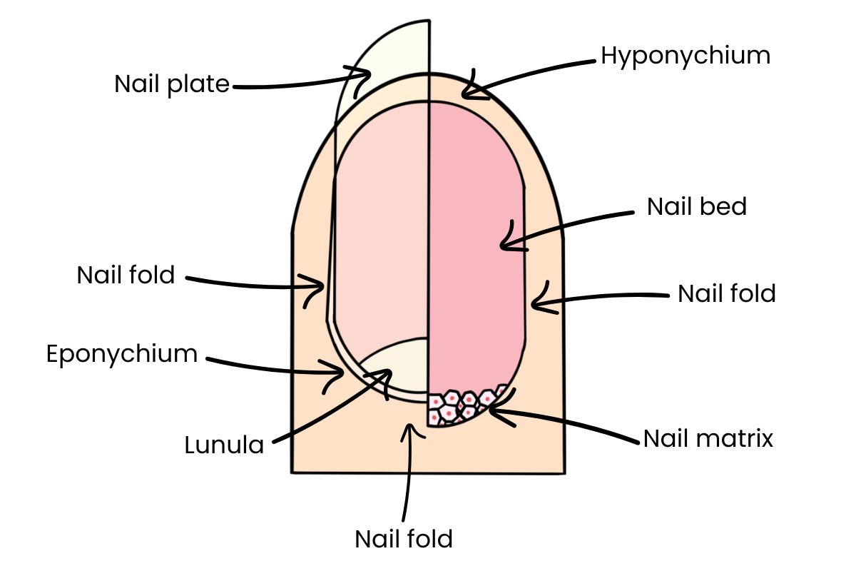 The nail unit consists of the nail plate, nail bed, hyponychium, nail matrix, lunula, eponychium and nail folds.