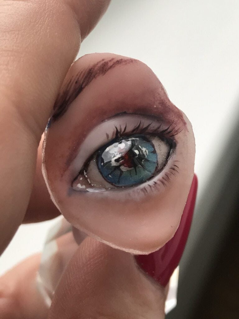 Now you can begin working with gel paints. These can be used to accentuate the perimeter of the eyelids, create playful effects within the iris and convey iridescent highlights. A white shade should be used for the final highlights.