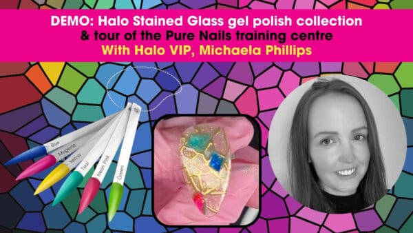 Watch Halo VIP, Michaela Phillips, demo the Halo Stained Glass gel polish collection and give a tour of Pure Nails‘ training rooms at Enhance Nail & Beauty Emporium.