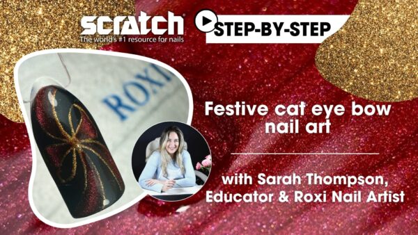 Educator, Sarah Thompson, showcases how to create a stunning festive bow nail design using the Roxi Cat Eye collection and NSI Tech-Gels, available via www.nsinails.co.uk