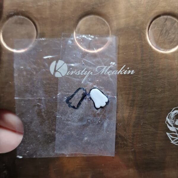 On a flat surface like a painting palette, place down some clear tape and draw two paw shapes with a marker pen. Fill them in with white acrylic and peel off once dried.
