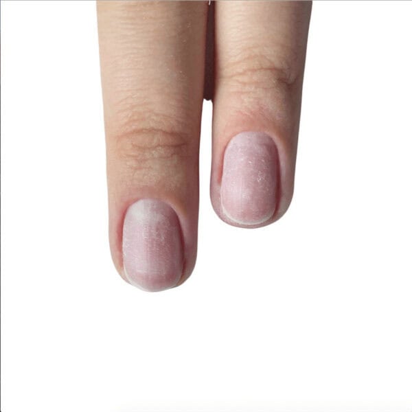 Remove the dispersion layer using Indigo’s Wipe Off Cleaner and refine the shape of the enhancement using a 180-grit file or Diamond 2 drill bit and Easy File Oil. Cleanse the nail and apply a thin layer of Indigo’s Mineral Base in Porcelain. Cure for 30 seconds.