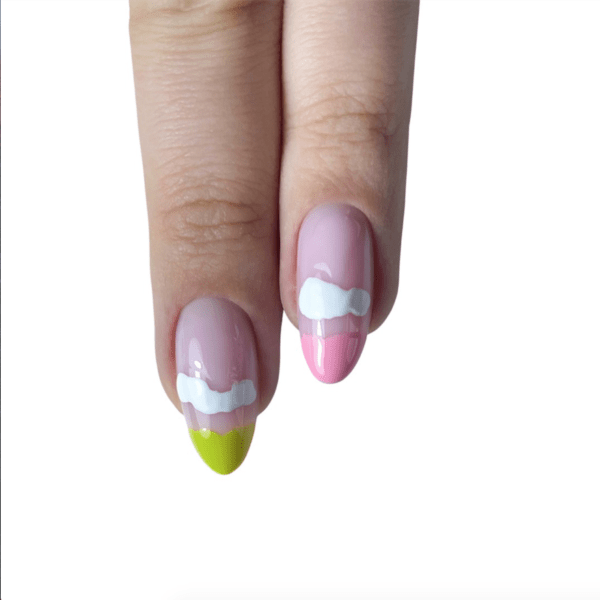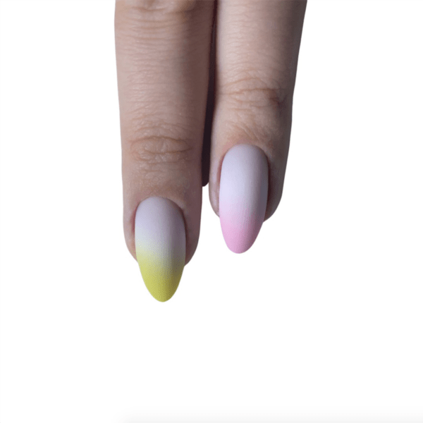 Start to create the ombré effect by applying a small amount of Mineral Base in Porcelain close to the cuticle area. Next, apply a strip of Sugar Effect UV Gel mid-way down the nail, before a pastel gel polish shade at each nail tip. I used the yellow Optymista and pink Nie Wiem gel polish shades. Use an ombré sponge to blend the shades, starting in the middle of the nail before moving to the tip then towards the cuticle. Use X-type tweezers to hold the sponge to prevent product flooding the cuticles or touching the skin. Do not cure. Sprinkle Fashion Clear acrylic powder onto the inhibition layer then cure for 30 seconds.