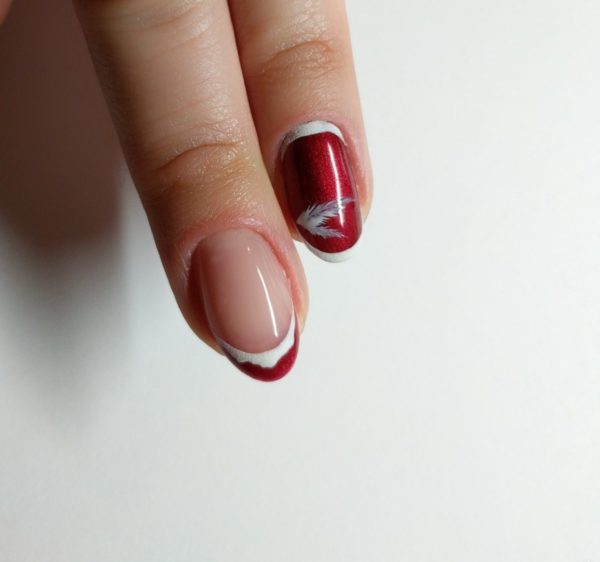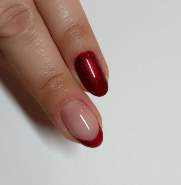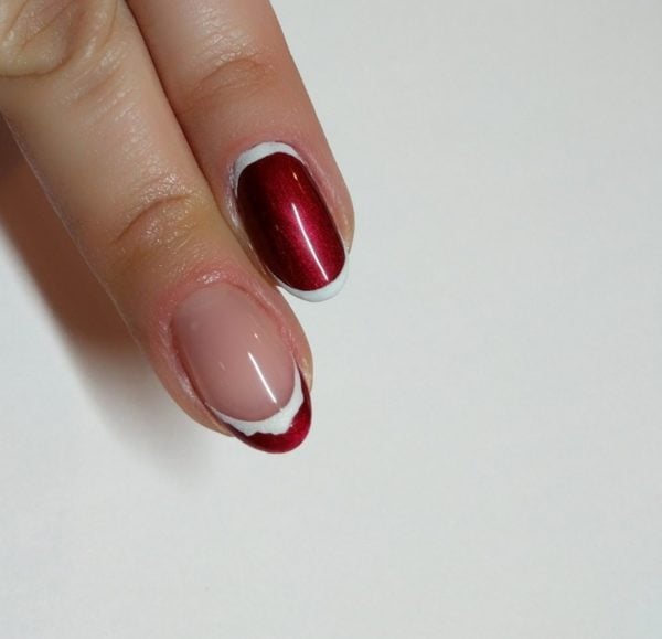Prepare the nails for Gelish Gel Polish application. Apply two coats of Wonder Woman on the ring finger. Create a French tip on the other nails using the same colour. Cure.
