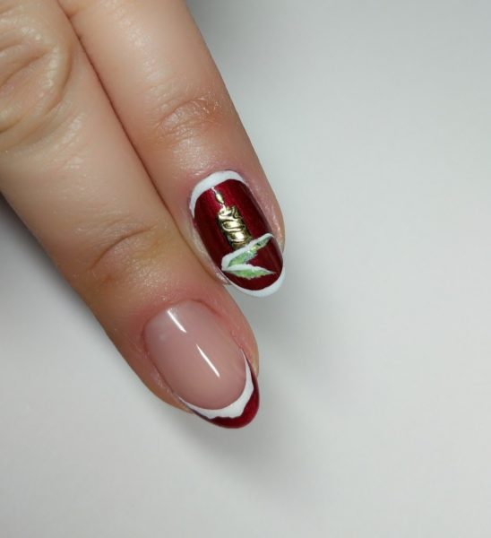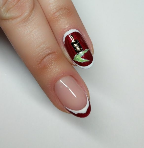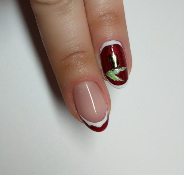Using different green Gelish Gel Polishes, add shades to the twig and cure. With All that Jazz 3D Nail Art Foil Gel, paint a candle, then cure. Press All That Jazz Gold Nail Art Foil on the candle.