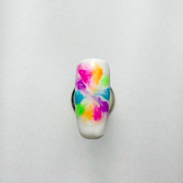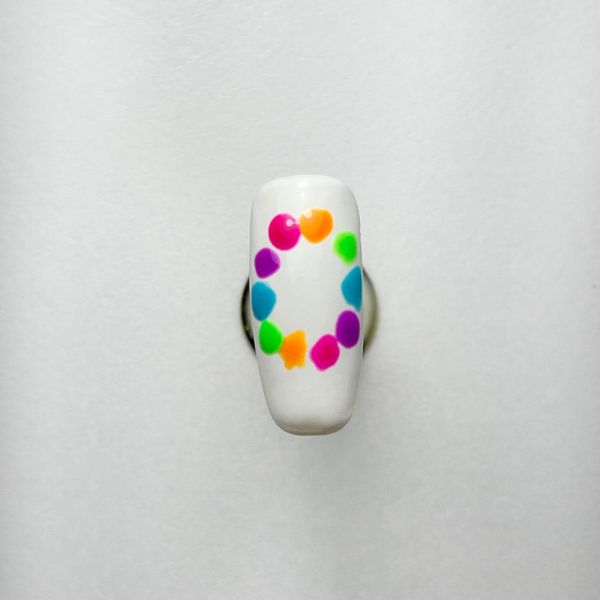 Paint a white gel polish over a prepped nail to create the base. Cure. Use a dotting tool to apply brightly coloured gel polish dots in a circular shape on the nail.