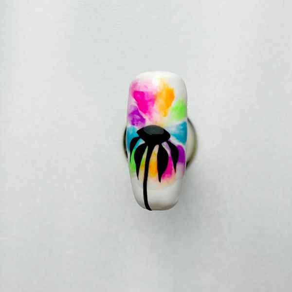 Using a gel polish base coat and brush, lightly drag the dots towards the centre of the nail to create a watercolour burst effect. Cure.