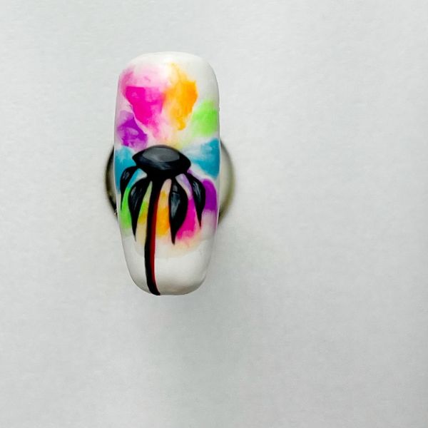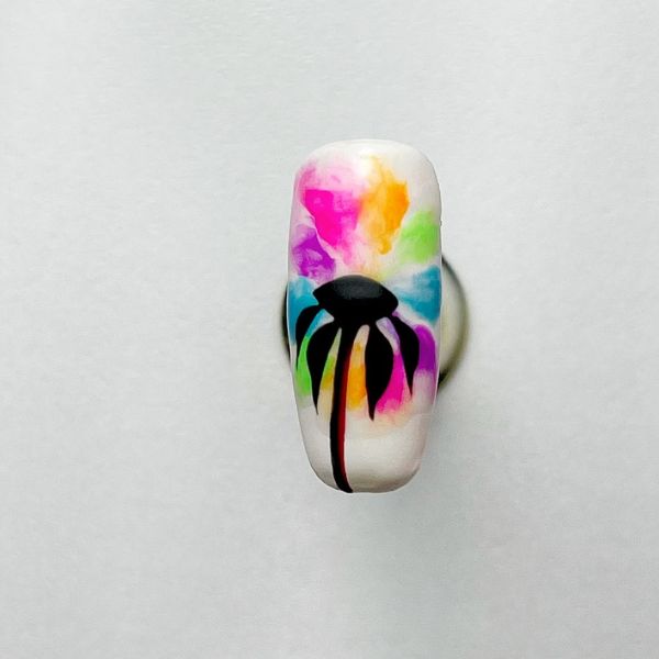 Darken and slightly thicken the petals using the black gel polish, to create contrast against the vibrant background. Cure. Add a red gel polish line to outline one side of the stem and create dimension. Cure.