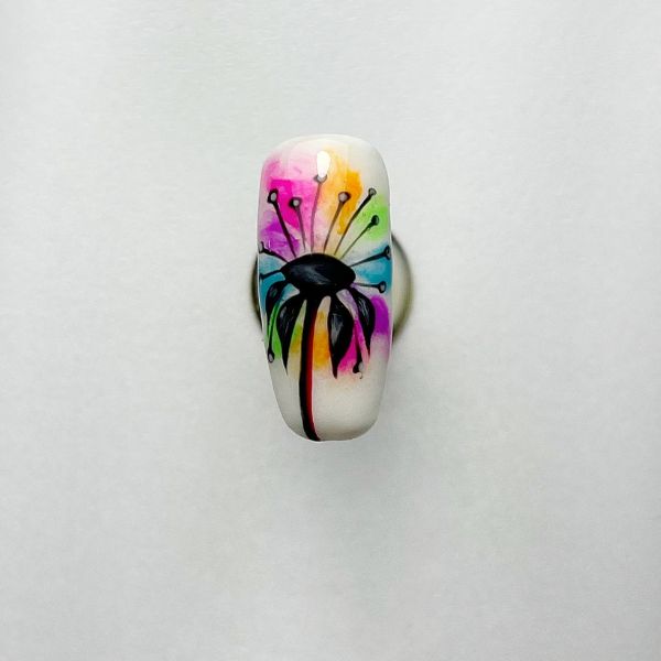 Use a fine liner brush and the black gel polish to paint thin lines radiating upwards from the centre of the flower, finishing each with a small dot. Cure.