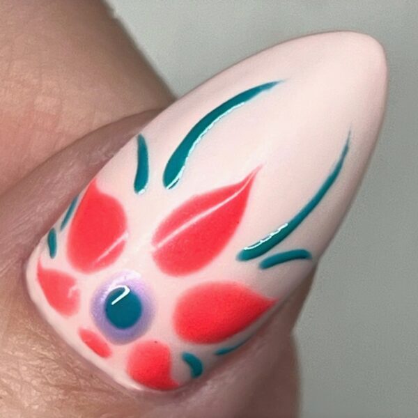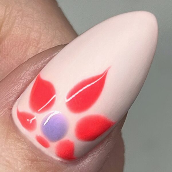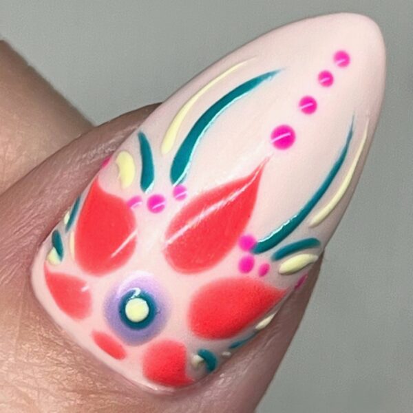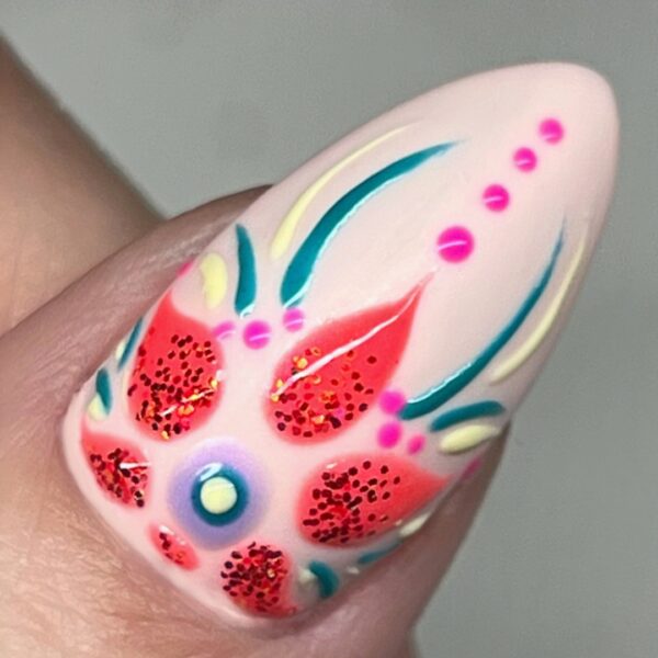 Using Seriously Succulent, add dots from the end of the central flower petal towards the tip of the nail and along the sides of the petal. Add the final dot to the centre of the flower using Totally Taffy, and use the shade to mimic the lines created with Holy Guacamole.