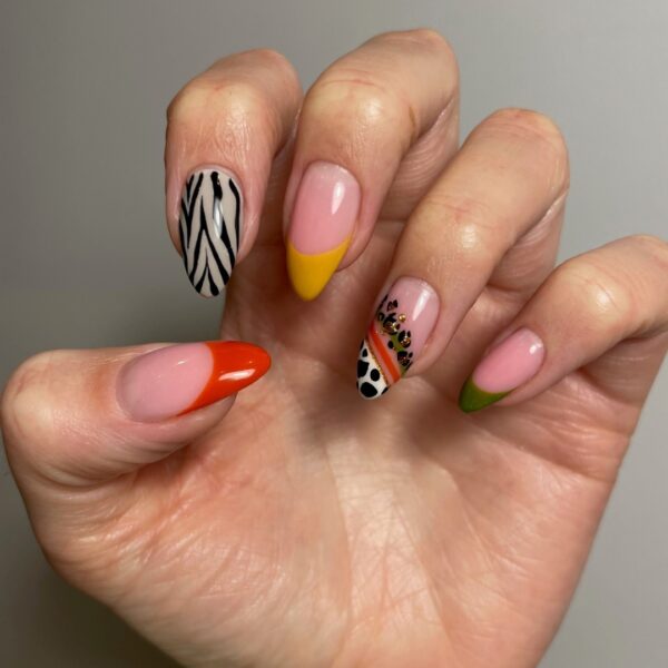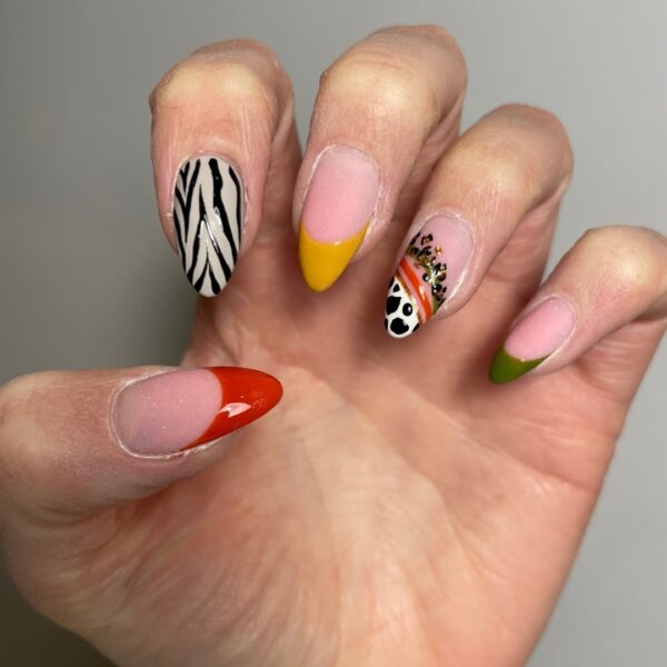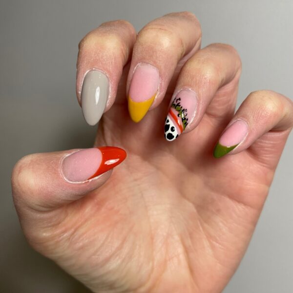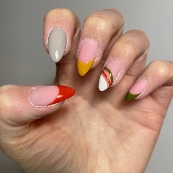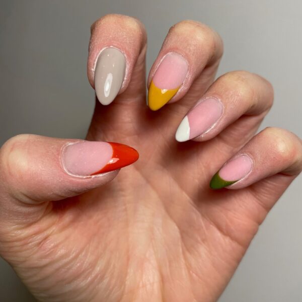 Create a French tip on the thumb using GELLUX Maple Dreams Come True. Paint GELLUX Mini, Absolute Greige, over the entire index finger. Continue creating French tips: using GELLUX Be A- maize-ing for the middle finger and GELLUX Wicked Game for the little finger. Apply GELLUX Purely White to the ring finger, creating a diagonal French tip. Cure for 60 seconds.